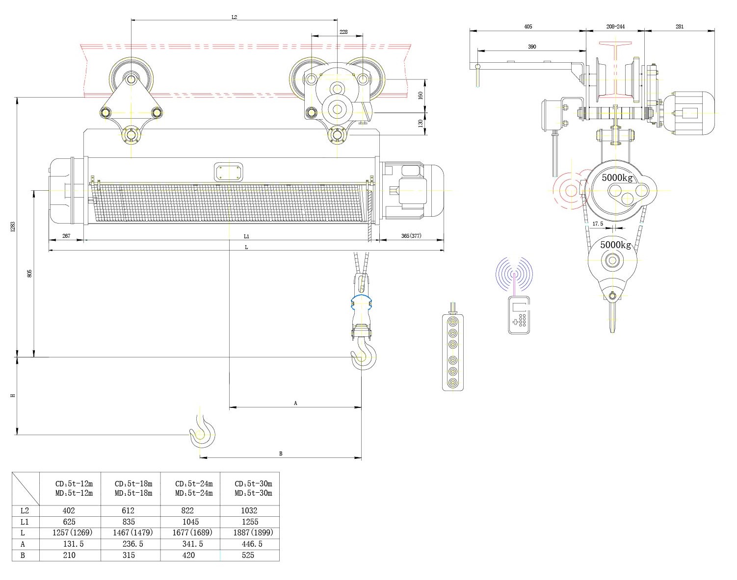 Таль электрическая канатная с тележкой передвижения BKS серия CD1-DH, грузоподъемность 5,0 тонн, высота подъема – 12,0 метров. Усиленная промышленная серия подходит для комплектации грузоподъемных кранов