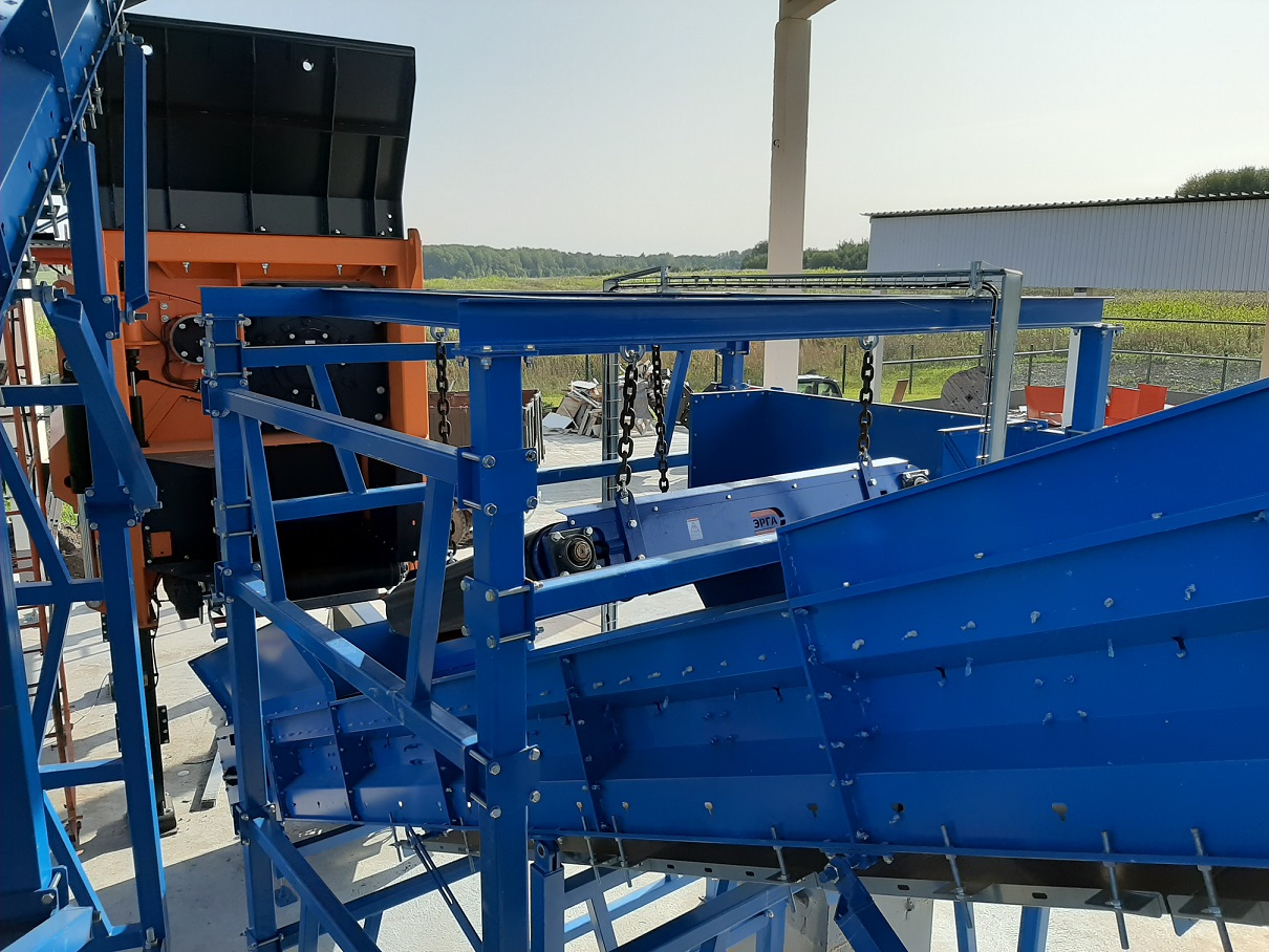 Отходы подающим конвейером поступают в переднюю часть звездчатого (роторного )сепаратора. Подающий конвейер оснащен ленточным магнитным сепаратором - железоотделителем, который отделяет содержащиеся в потоке включения металлов (гвозди, фрагменты мебельной фурнитуры и пр.) На звездчатом сепараторе происходит разделение материала на два потока, целевая фракция (размером не более 50 мм) просыпается сквозь отверстия в просеивающей деке, а фракция более 50 мм проходит далее и на выходе из сепаратора попадает в приемный бункер возвратного транспортера. Возвратный транспортер подает часть отходов обратно в приемную воронку дробилки на повторное дробление.